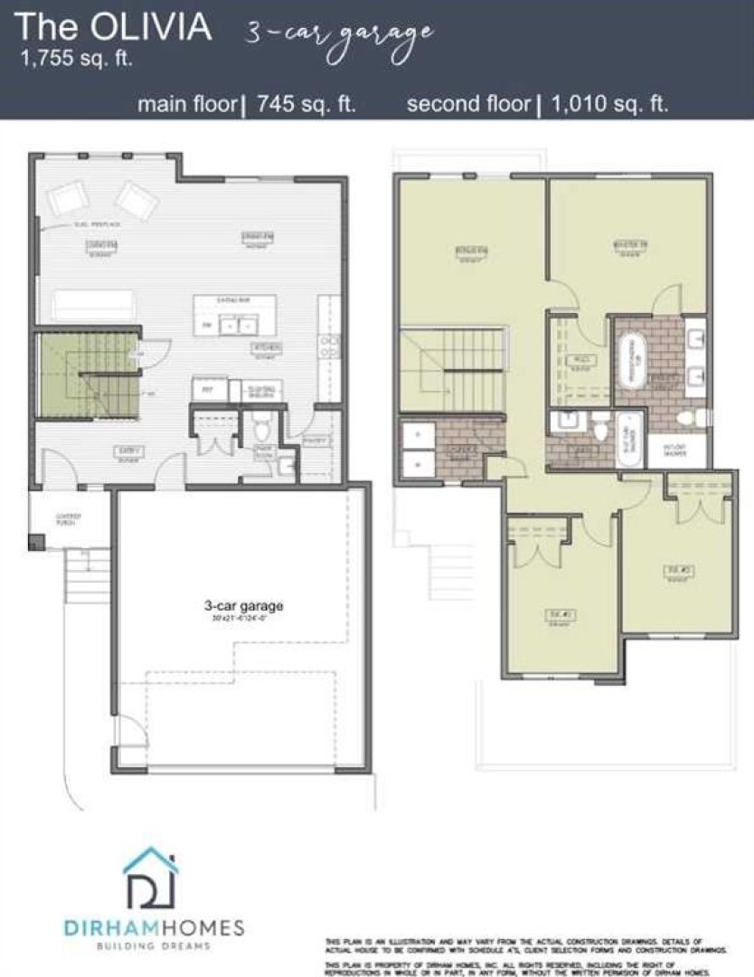 Dirham Homes Job #2503 The Olivia 3 Car on pie shaped lot near trees and playground. This is one of Dirham Homes' most loved floor plan! It features an open main floor living/dining/kitchen area with electric fireplace, central island with seating, quartz counters, walk in pantry, built-in cabinet for microwave, and garden door. There is also a 2pc washroom on the main floor. Upstairs you will find a 2nd living space/bonus room as well as 2 bedrooms, full bathroom, laundry room, and the primary suite with walk in closet and gorgeous ensuite with free standing tub, separate tile & glass shower, and double vanity! This home is cozy, contemporary, and has all the 'must haves'. It also has a side door entry for possible future suite if you wanted to add one (subject to City approval).
